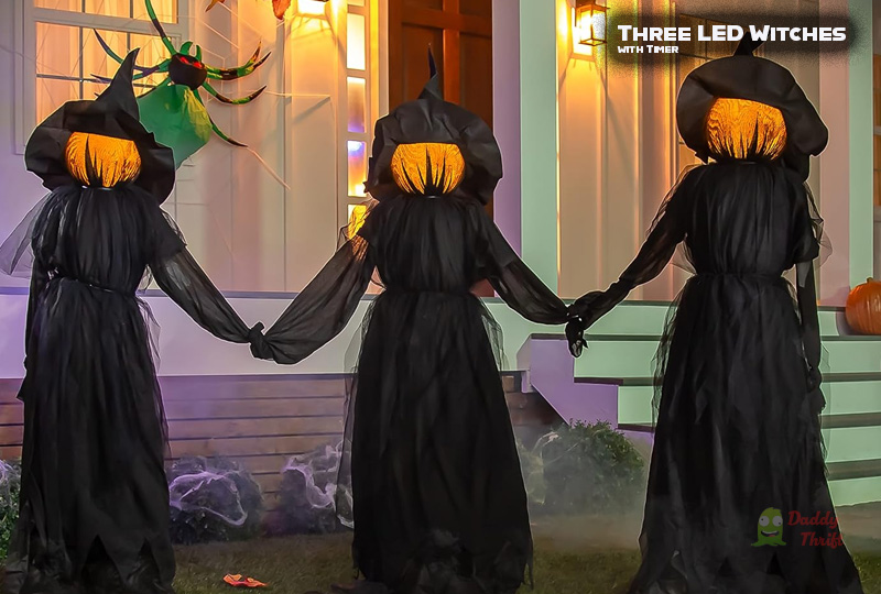 Each of the three witches stands 4 feet tall, casting an imposing figure. The eye-catching design features a flickering, faceless head that glows ominously, perfect for captivating anyone who dares approach your domain. Whether placed along your driveway to welcome guests or in the garden to surprise unsuspecting trick-or-treaters, these witches ensure your home stands out in your neighborhood’s Halloween decor contest.